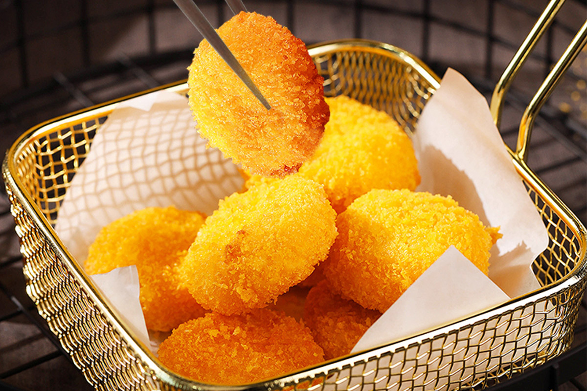 3、將南瓜面團(tuán)冷藏20分鐘,鋪薄層生粉,裹上蛋液,蘸面包糠;